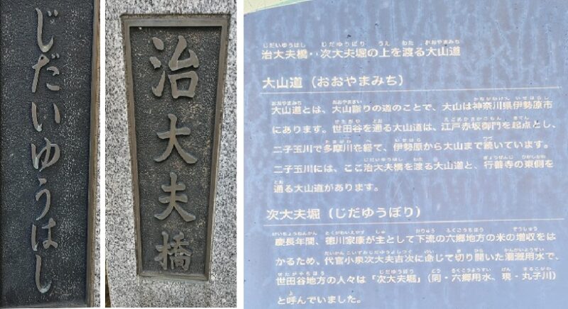 川崎も東京も用水に関しては次大夫の名が一切使われていない中で、何故か世田谷だけが堀名、公園名、そして橋名に使用する。橋名に関しては、「次」を「治」に変え「じだいゆう(治大夫)」と読ませるような面妖さがあり、この点は橋の制作担当者の意図を聞かなければ分からない事であり、仮名手本忠臣蔵のような「実在の人物との同一性を否定する」という法的・社会的な防衛策(幕府からお咎めを受ける)という大時代的な要因が当時あったのか、次大夫が登録商標だったなんてあり得るべくもない、もしかすると単に気まぐれか。一体どう整理されているのだろう。おそらく今の役所の人は誰も理解していないような気がする。