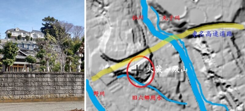 殿山は南側の野川に沿った崖線の端で、国分寺崖線の舌状台地が北側の仙川に切り取られ、西の大蔵地域と長細い島状態となっていたが、東名高速道路の開通により、更に切り離され孤島のようになっている。地理院地図(本稿の地図及び数値の参照先)によれば標高約30m、地上高は約15mとなっている。
