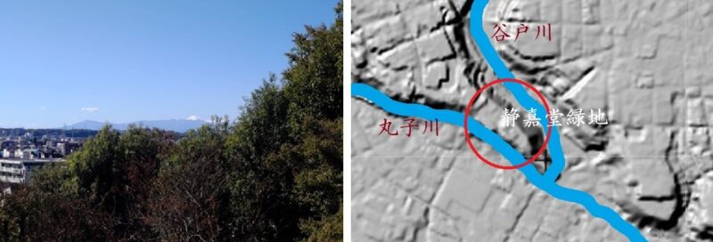 静嘉堂緑地は三菱の2代、4代社長を務めた岩崎彌太郎、小彌太親子の霊廟と、小彌太が蒐集した古文書を管理する文庫が存在する。小彌太の代に周辺を大々的に取得したようで、父親が亡くなった際にその中心的場所(多摩川と谷戸川が侵食した舌状台地の先端部分)に玉川霊廟を建築した。標高約34m、地上高約20mとなっている。